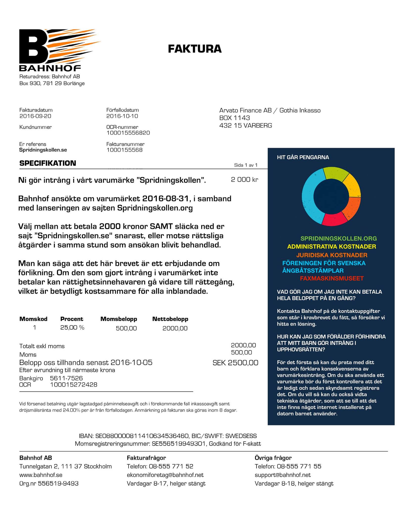 Den uppenbara passningen till Spridningskollens ersättningskrav på just 2 000 kronor skickades tillsammans med ett meddelande som förklarade att brevet skulle ses som ett erbjudande om förlikning. Med ett matchande pajdiagram som visar vart pengarna kommer att gå. Bland annat Faxmaskinsinstitutet, Föreningen för svenska ångbåtsstämplar och Spridningskollen.org (En sajt som försöker stoppa Spridningskollen).