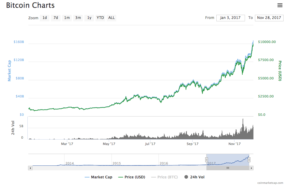 Den största digitala kryptovalutan Bitcoin har under året sett sitt värde stiga lavinartat. I januari månad hade valutan ett värde på omkring 1 000 dollar och under de tre senaste månaderna har värdet stigit från 3 000 dollar till smått tokiga 10 000 dollar. En ökning på hela 1 000% detta år.