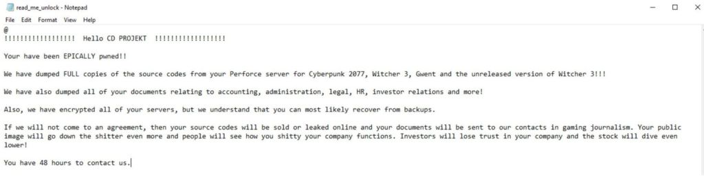 Inkräktarna fortsätter med att säga hur de tänker släppa all information de kommit över om företaget inte tar kontakt med förövarna inom 48 timmar och går med på en uppgörelse. CD Projekt RED nämner dock i sitt Twitter-inlägg att något slags avtal inte kommer att slutas och att polis har kontaktats.