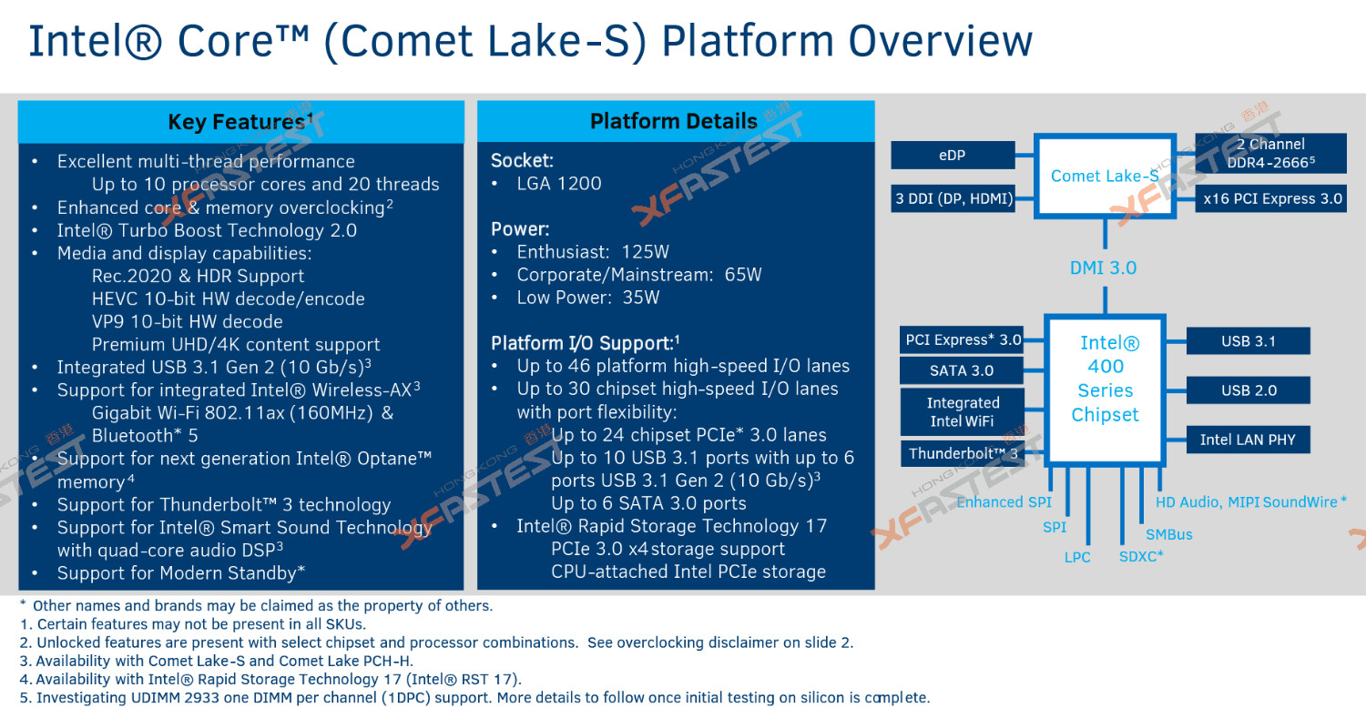 Enligt de läckta bilderna ska den kommande processorfamiljen börja rullas ut under 2019 års tredje kvartal och en lansering för konsumenter kommer att ta plats i början av 2020. Den kommande familjen sägs delas upp i tre kategorier: 125 watt (W), 65 W och 35 W TDP. Processorfamiljen hävdas även innehålla enheter med upp till tio processorkärnor och 20 trådar. Ett steg uppåt jämfört med dagens konsumentprocessorer som levereras med upp till åtta kärnor och 16 trådar.