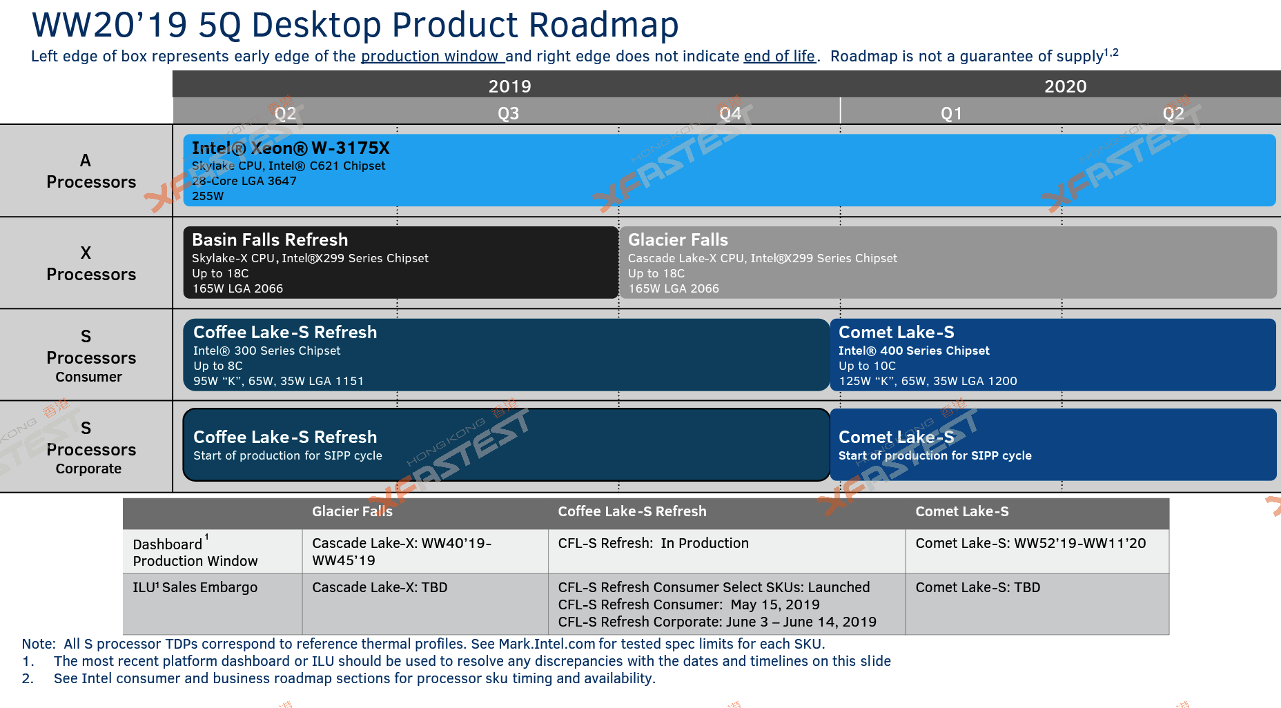 Bilderna som sägs komma direkt från Intel visar även hur denna kommande plattform kommer att få funktioner som Wifi 6, Thunderbolt 3 och USB 3.1 gen 2 integrerade. Produktplanen visar även att Intels nuvarande processormodell Xeon W-3175X med sina 28 kärnor och 56 trådar fortsätter vara tillverkarens enhet med flest processorkärnor fram till andra kvartalet 2020 som tidigast. Bilderna visar även vad vi tidigare vetat, att det blir Glacier Falls och Cascade Lake-X som blir arvingarna till dagens Basin Falls Refresh och Skylake-X-processorer.