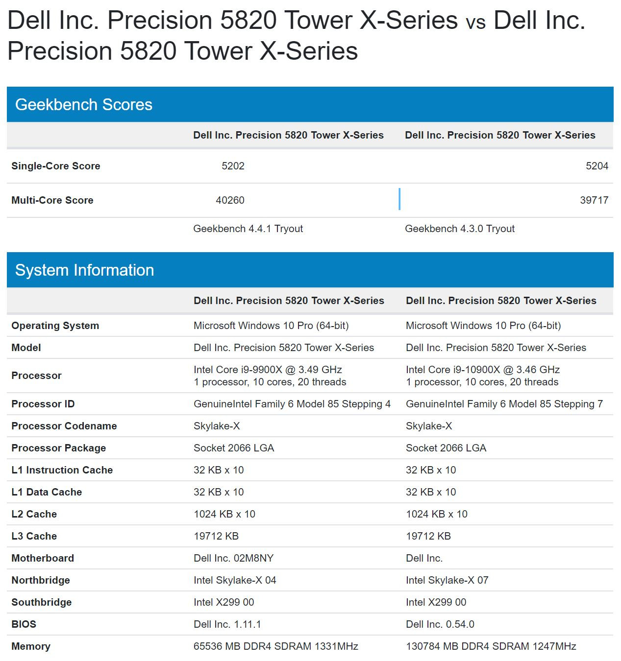 En av Intels kommande processormodeller ur familjen Cascade Lake-X har nu dykt upp i databasen för den syntetiska testsviten Geekbench 4. Mer specifikt rör det sig om den tiokärniga processormodellen Core i9-10900X som installerad i en Dell Precision 5820 Tower testats i applikationen.