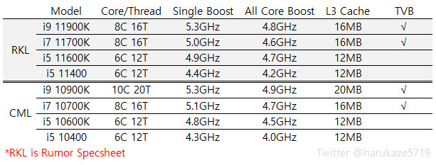 Enligt de ryktade specifikationerna blir det åtta kärnor som huseras i Intels två kommande toppmodeller i Rocket Lake-familjen. Den tidigare nämnda Core i9-11900K och Core i7-11700K. Dock kommer den sistnämnda med en lägre enkärnig turbofrekvens på 5 GHz och en maximal turbofrekvens på 4,6 GHz för samtliga kärnor samtidigt. Turbofrekvenserna hos i7-modellen ser således ut att kunna bli 100 MHz lägre än hos föregångaren Core i7-10700K. Hos den kommande flaggskeppsprocessorn är det 100 MHz lägre turbofrekvens på den flerkärniga turbosidan. Den listas även med fyra megabyte mindre L3 cache än sin föregångare.
