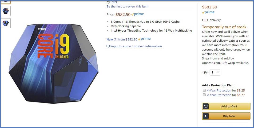 Detta kommer till en början från Twitter-kontot Momomo_US som hittat Amazons produktsida för processorn och lagt upp skärmdumpar på Imgur. Senare ska Tom’s Hardware ha hittat samma produktsida och kunnat bekräfta dess existens. Dock länkar ingen av källorna till den faktiska produktsidan för Core i9-9900K.