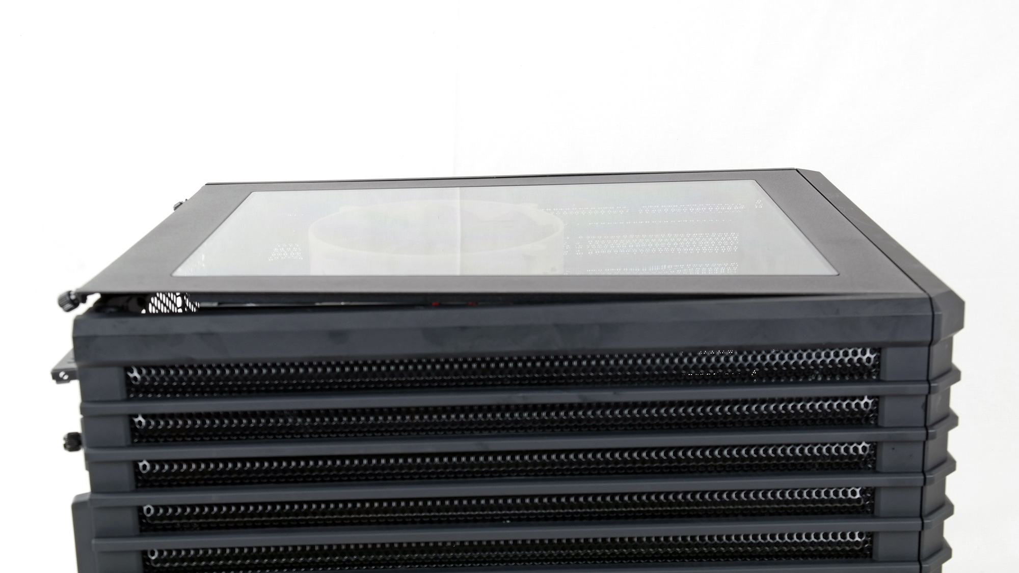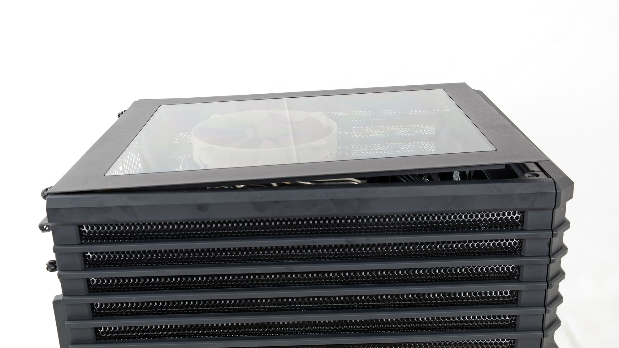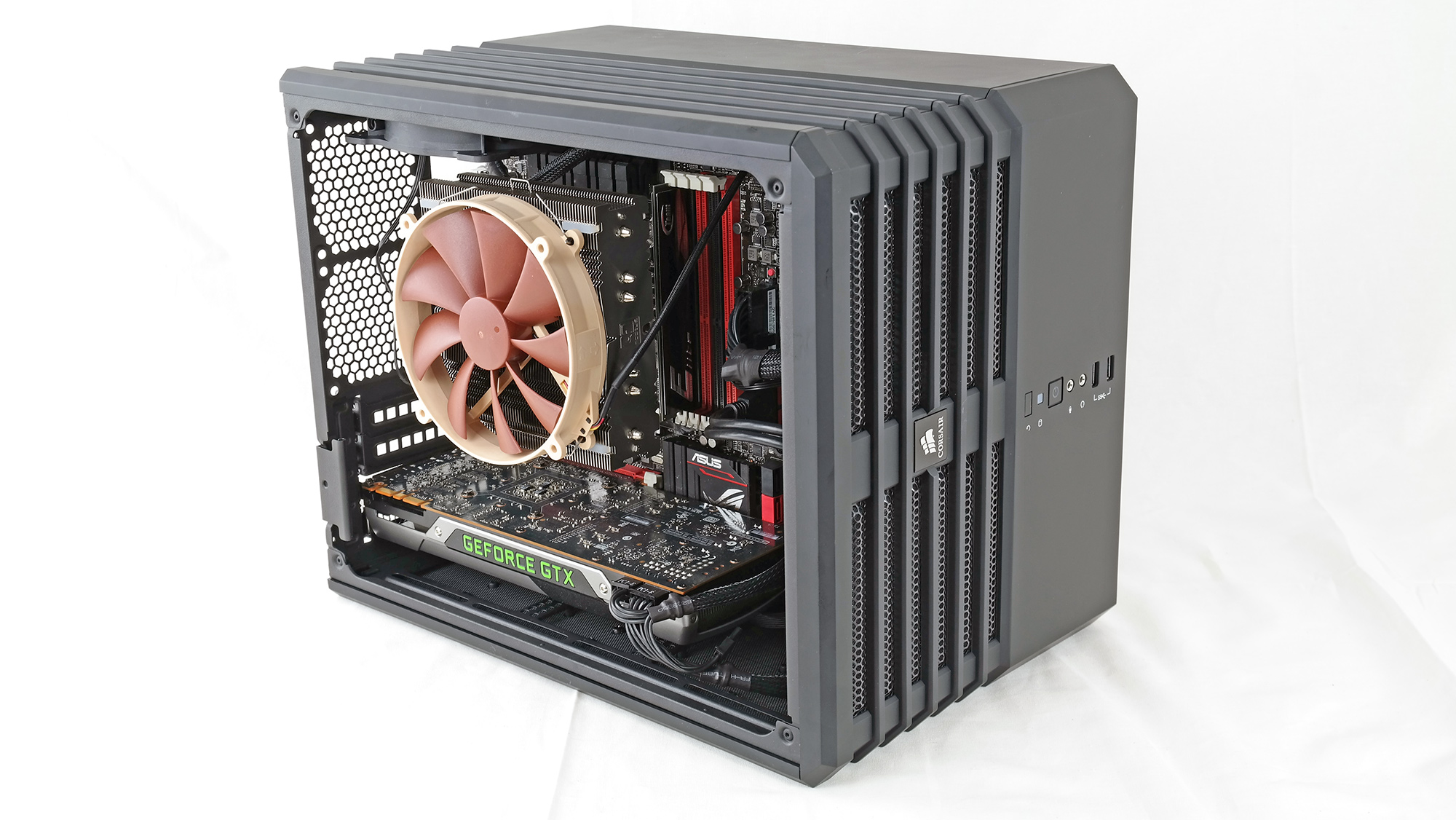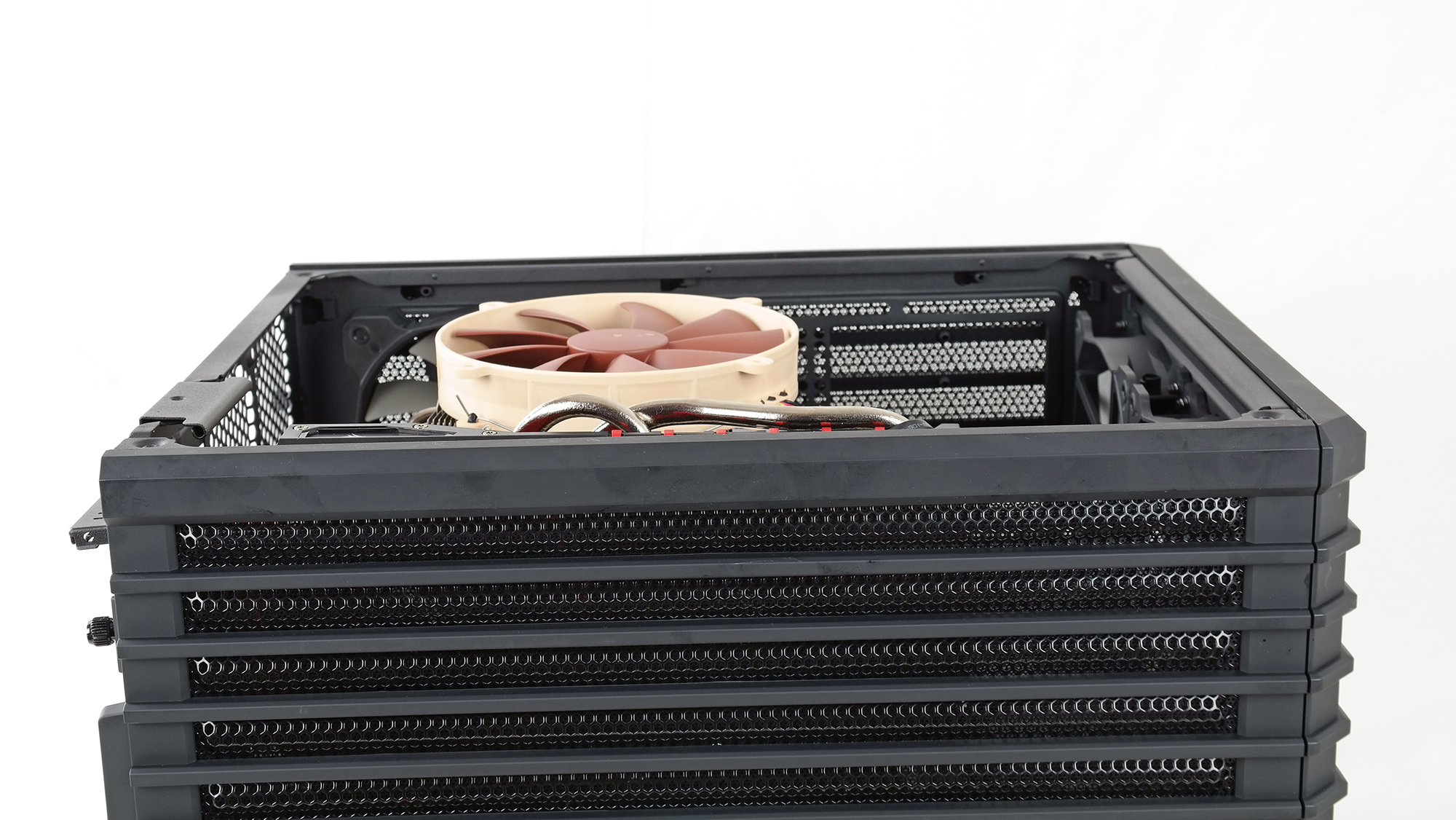 Vi har monterat in vad vi med ganska god säkerhet kan säga är en av de största tornkylarna du kan få in i chassit – Noctua NH-C14 med en höjd på 140 millimeter inklusive fläkt. Vår konfiguration rekommenderas inte men visar trots allt var det maximala måttet för en tornkylare hamnar. Istället skulle vi rekommender en vattenkylningslösning, framförallt eftersom Corsair har öppnat upp för många lösningar och monteringsplatser för just detta. Vilket i sig inte är särskilt oväntat då chassitillverkaren även säljer sina egna slutna vattenkylningssystem.