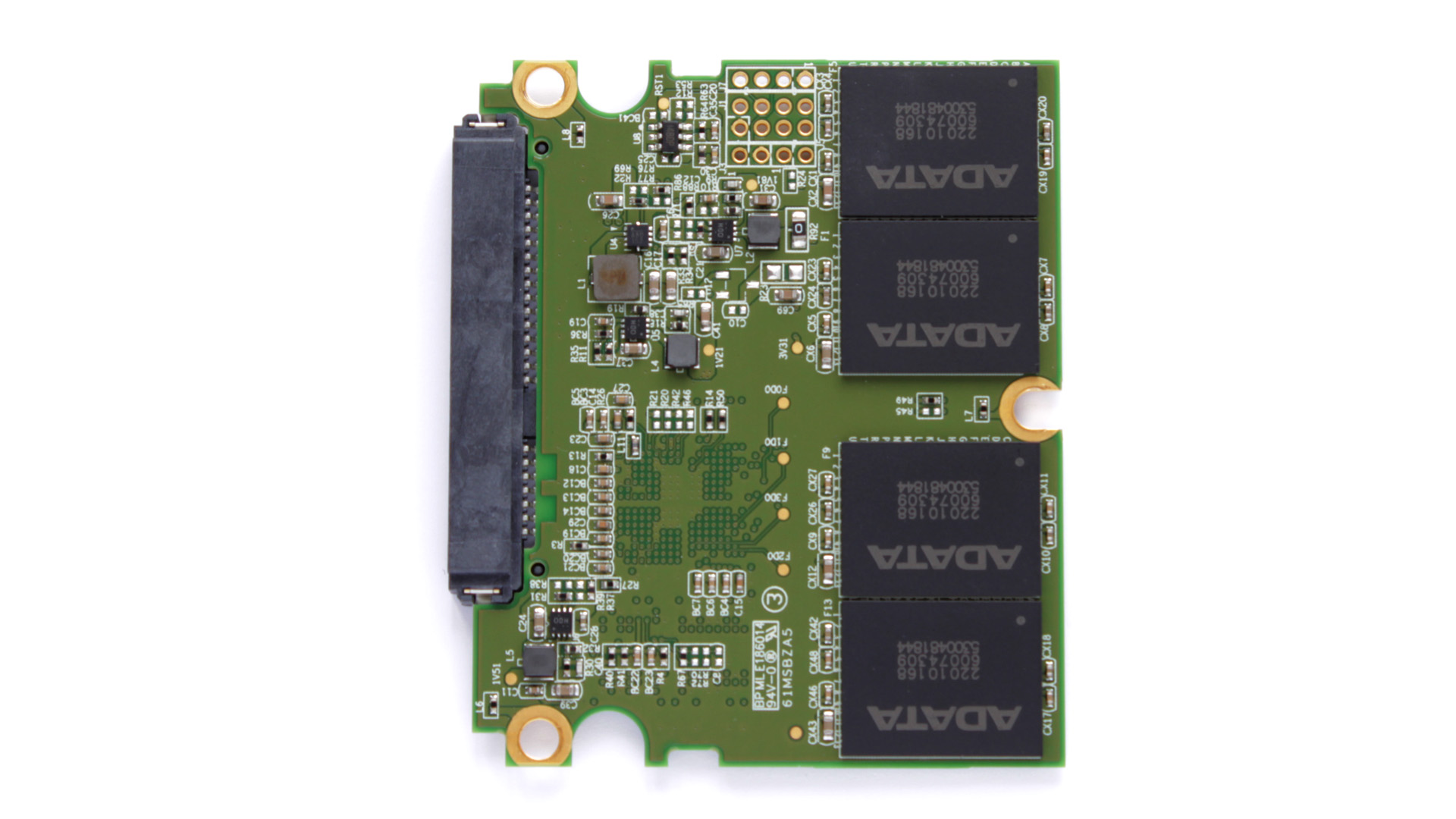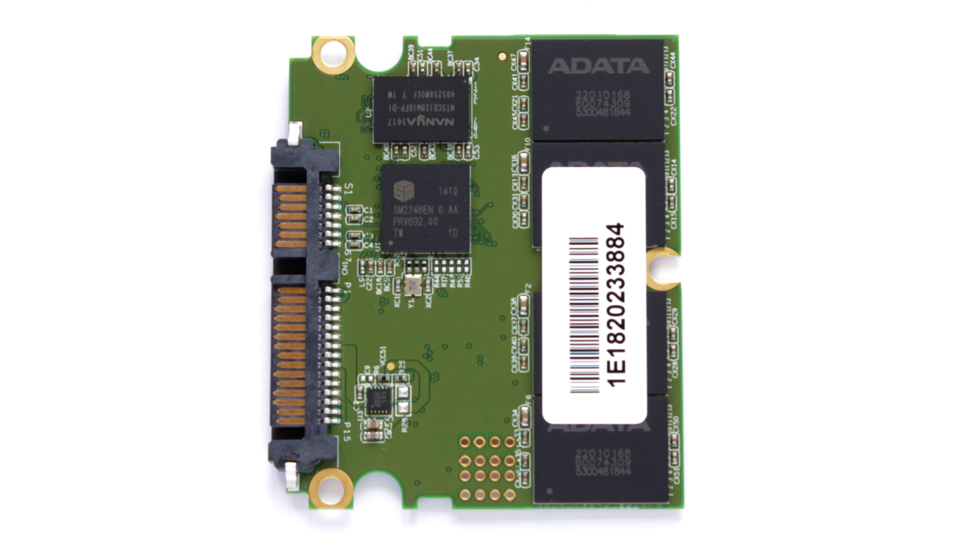 Likt andra enheter med SMI kontroller så använder sig Adata av ett något mindre kretskort och ungefär halva chassit är helt tomt. På kretskortet hittar vi givetvis kontrollerkretsen från SMI. Förutom denna så hittar vi också ett extern DRAM i form av ett Nanya NT5CB128M16FP. Detta är ett DDR3 minne på 256 megabyte och faktiskt exakt samma som vi hittade i Corsair Force LX 256GB.