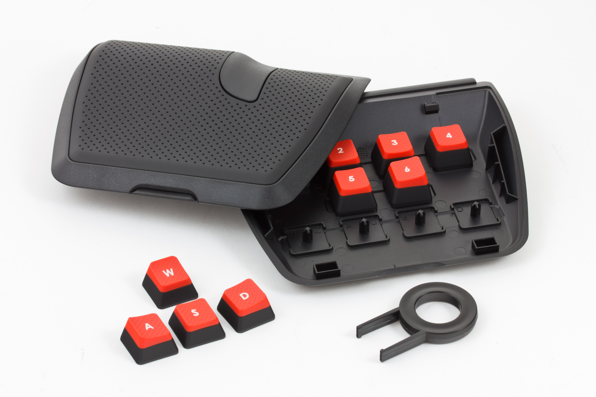 Medan tangenterna på K60 inte är bakgrundsbelysta så kan flera av dem (mer specifikt WASD-klustret samt siffertangenterna 1 till 5) bytas ut mot röda gummerade tangenter, och Corsair skickar med ett litet verktyg för just det ändamålet. Extratangenternas ytor är inte bara gummerade utan också något vinklade för att man enklare ska hitta vilken tangent som är vilken utan att släppa blicken från det pågående spelet. Tangenterna kan, när det inte används, förvaras inuti Corsairs något annorlunda handlovsstöd.