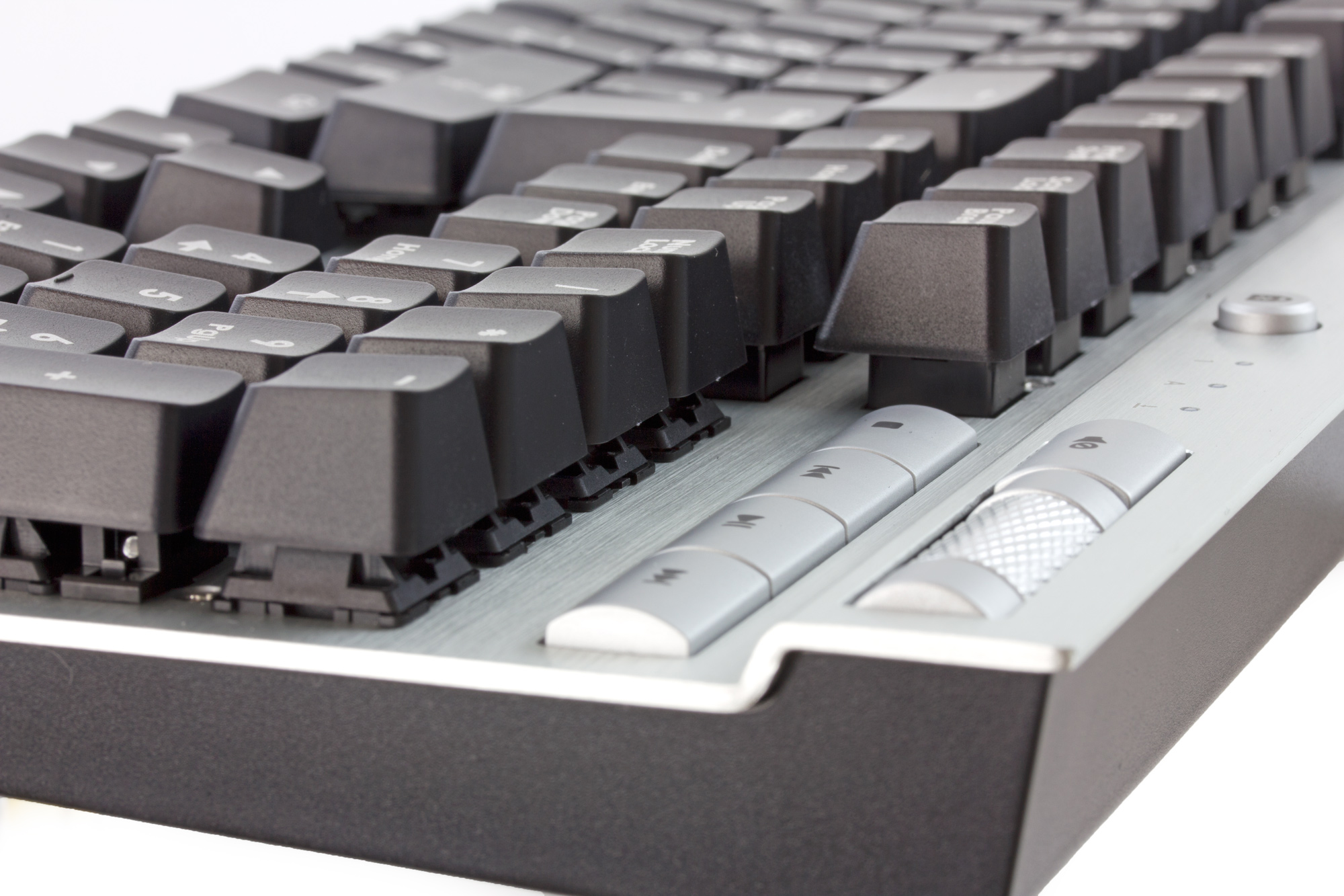 Med fyra knappar ovanför Esc och de första F-tangenterna kan man programmera makrotangenterna samt välja mellan tre olika profiler med olika makron. Längre till höger på tangentbordet finns också en knapp för att variera bakgrundsbelysningen i fyra olika nivåer (låg, medium, stark och av) och bredvid den en knapp för att deaktivera Windowstangenten och därmed undvika en oläglig minimering av ett pågående spel. Alla dessa knappar är gjorda i plast målad för att matcha tangentbordsbasens aluminium, och kan tyckas ha något tveksamt kvalitetsintryck. Det känns tydligt att de är i plast och de känns något mosiga att trycka ner, men de fyller sin funktion utan problem. Längst till höger finns mediatangenterna i form av en mute-knapp bredvid ett volymreglage, och under dessa finns knappar för play/pause, stop och för att byta spår framåt eller bakåt. Som volymreglage har Corsair valt att använda en cylinder, med ett våffelliknande räfflat mönster för bättre fäste, som kan roteras kontinuerligt uppåt och nedåt.