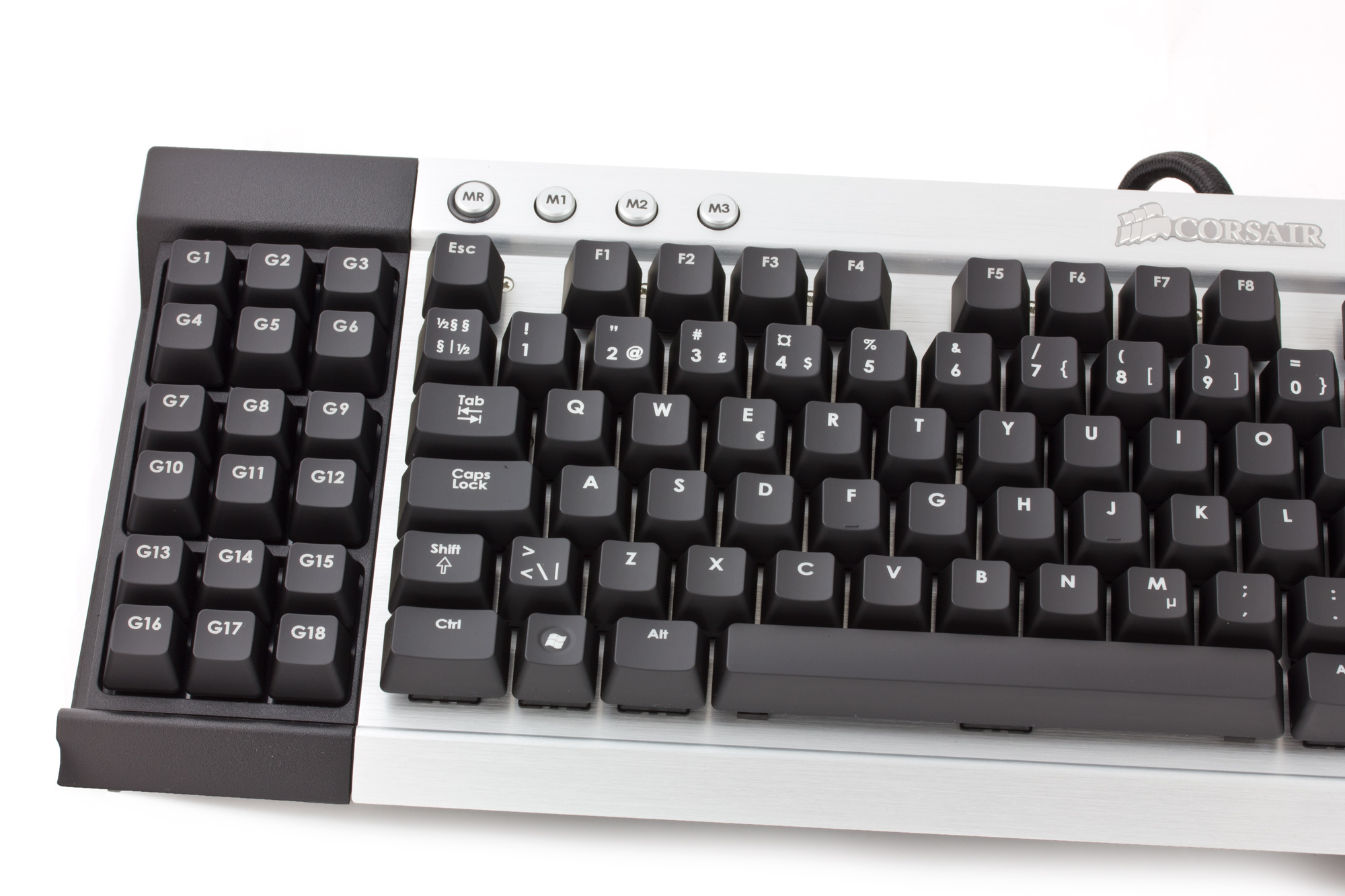 Men även om bakgrundsbelysningen är knivskarp och vacker kring huvudknappsatsen, piltangenterna och sifferknapparna, så snubblar Corsair åter igen något på valet att använda olika brytare till olika delar av tangentbordet. Membrantangenterna är byggda på ett helt annat sätt, och belysningen på dessa är mörkare och luddigare, och ger inte alls samma “upphöjda” intryck som de mekaniska tangenterna. Mest av allt sticker makroknapparna ut, då Corsair av någon anledning valt att ge dessa vit bakgrundsbelysning istället för den blå som används till resten av tangentbordet. Tillsammans med plastbasen och den nedsänkta profilen fås intrycket att makroknapparna knappt verkar vara en del av samma produkt som övriga tangenter, och kvalitetskänslan blir väldigt ojämn.