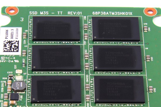 Minneskretsarna är inte heller några nyheter. Även om det är lite svårt att se det på bilderna så är det 8 stycken Toshiba TH58TV68D2FBA89 minneskretsar. Varje krets huserar hela 32GB per krets och är baseras på Toshibas 32nm teknik. 32GB per chip är ovanligt med 32nm teknik. Det innebär att Toshiba har slagit ihop flera NAND-enheter i samma förpackning. Fler NAND-enheter har både fördelar och nackdelar. Fördelarna är framförallt ökad sekventiell skrivprestanda med hjälp av Interleaving. Nackdelen är att fler NAND-enheter med lägre lagringkapacitet är dyrare att tillverka och köpa, vilket resulterar i dyrare SSD. Vill du läsa mer om hur Interleaving fungerar, titta på vår artikel Sverigest Största SSD test – Hösten 2011.