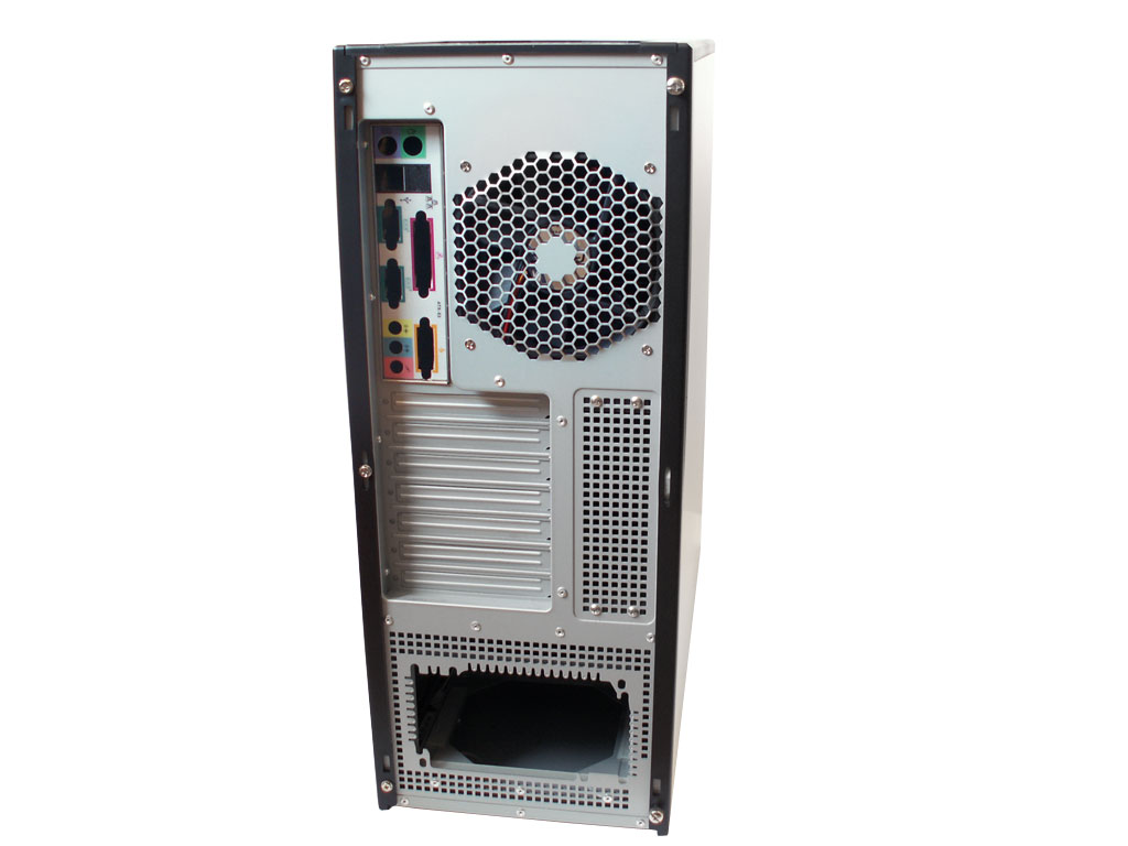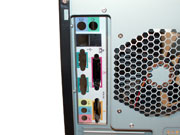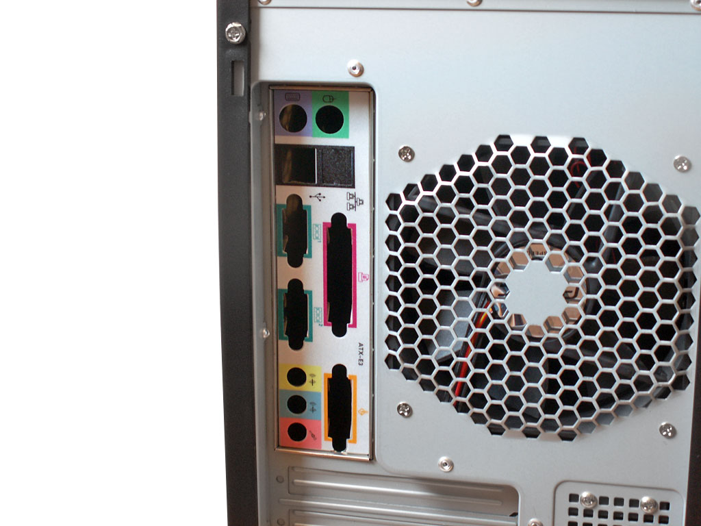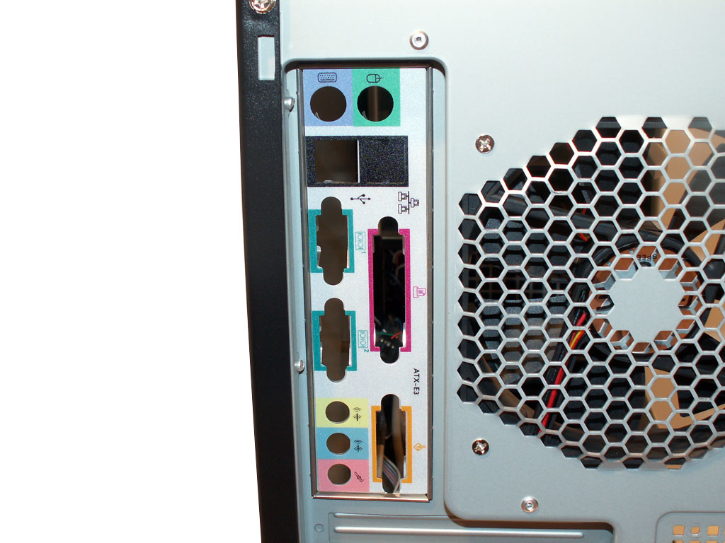 Om man på ett enkelt sätt kan ta loss hårddiskhållaren kan det vara bra att göra detta innan man börjar installera komponenterna i datorn, man vill helt enkelt ha så mycket plats som möjligt i chassit när man börjar. En annan detalj man måste lösa innan man installerar några fler komponenter i chassit är I/O-plåten. I/O-plåten är namnet på den platta som sitter på baksidan av chassit där moderkortets in och utgångar ska passas in. Mer eller mindre alla chassi levereras med en standardplåt som dock sällan passar moderkortet du köpt då moderkortstillverkaren väljer egna in och utgångar på sina moderkort. Därför måste man oftast byta ut chassits I/O-plåt mot en som du får med i moderkortet. För att lossa plåten trycker man på den innåt chassit, plåten lossnar då och flyger in i chassit. Ta sedan fram din moderkortsplåt och tryck den på plats inifrån chassi. Vår plåt kom med en klistermärkeskarta som även visar de olika in och utgångarna, men det är inte något man får med alla moderkort, ofta är plåten bara “ren” med små trycka symboler vid varje in och utgång.