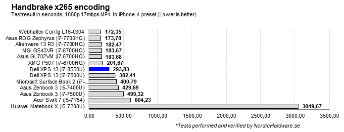 I vårt Handbreak-test så gynnas Dell XPS 13 av den nya fyrkärniga processorn samt aktiv kylning vilket gör att den nästan kan hålla jämna steg med gamingmodeller.