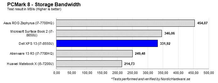 Lagringsbandbredden är inte XPS 13 starkaste sida men fortsatt inom vad i är vana vid att se hos de mer slimmade modeller vi har testat som bygger på PCI-E-baserade SSD-lösningar.