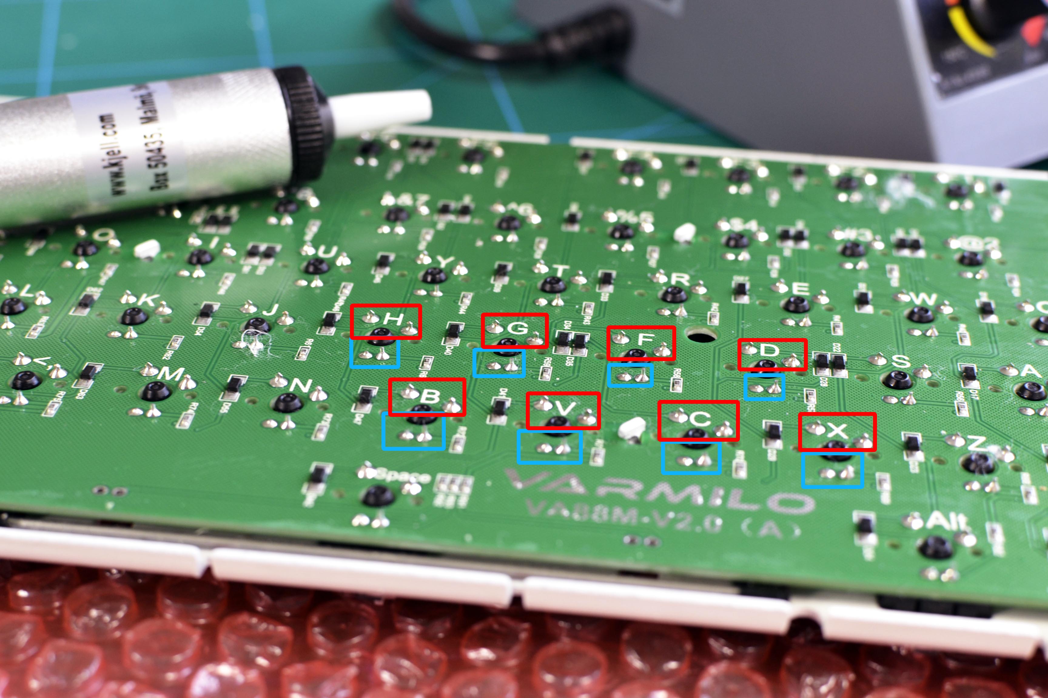 Vårt Varmilo-tangentbord har lysdioder installerade i brytarna, vilket innebär dubbelt så mycket jobb eftersom att även dessa måste avlödas. Vi har markerat brytarens kontakter med rött, och lysdiodernas kontaktpunkter med blått i bilden ovan.