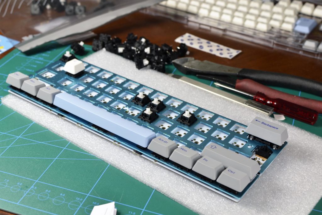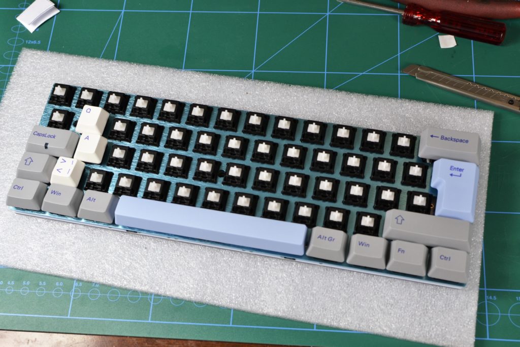 Vi använder återigen våra brytarlock för att se till att vi hamnar i rätt hål, eftersom att både vår monteringsplatta och PCB är universella; det kan av den anledningen bli svårt att hitta rätt på bottenraden som stödjer flera layouter. Det är inte svårare än att vi monterar brytarlocken på de brytare vi vill ha på vår bottenrad, och sedan radar vi upp dem så att de får plats. Layouten som vi använder är vad som anses vara “standard”, men oavsett vilken layout Du själv väljer att använda så är det alltid bra att dubbelkolla så att allt hamnar rätt på de platser där monteringsplattan och kretskortet har plats för fler än en brytare.