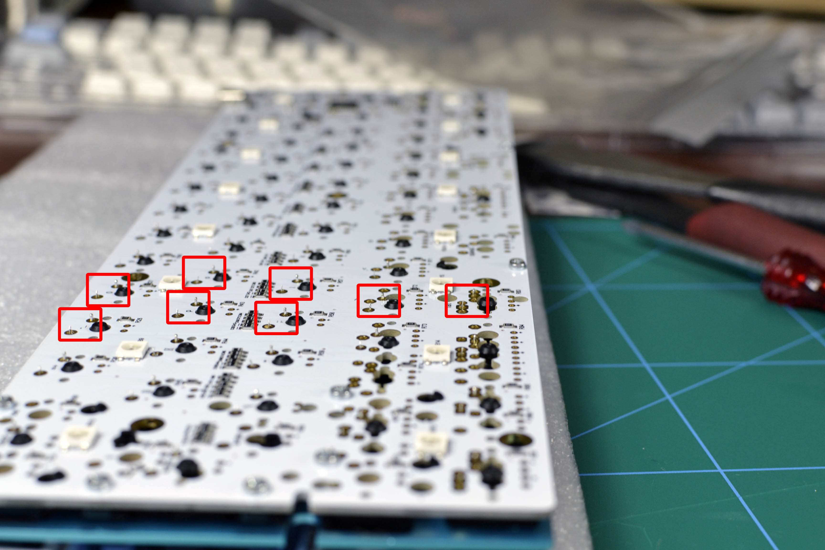 Med alla brytare ditsatta på kretskortet, använd både med ögon samt fingrar för att säkerställa att det är två kontaktben per brytare som sticker upp på kretskortets baksida. Vi kan inte alltid lita på att ögonen, av den anledningen är det viktigt att också använda vår känsel. Vi tar en rad i taget och säkerställer att alla kontaktben ligger rätt.