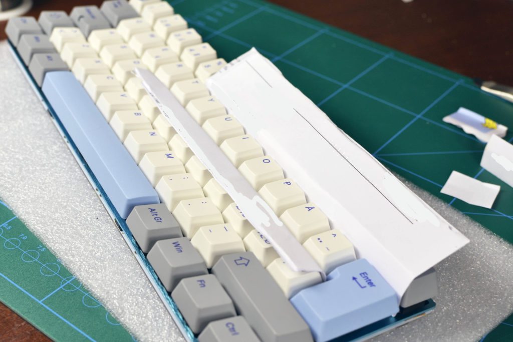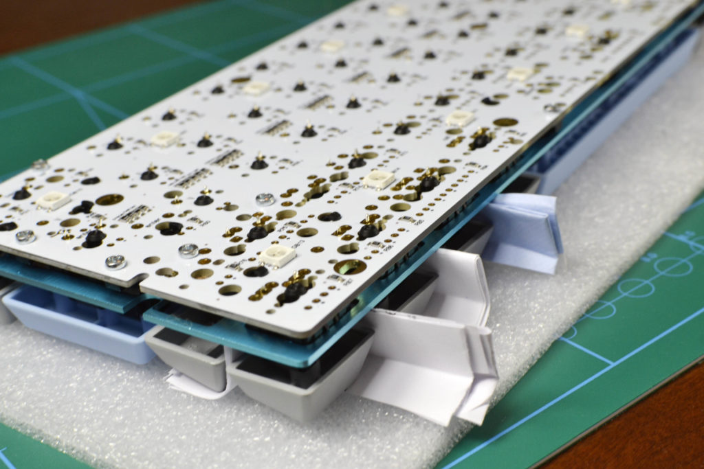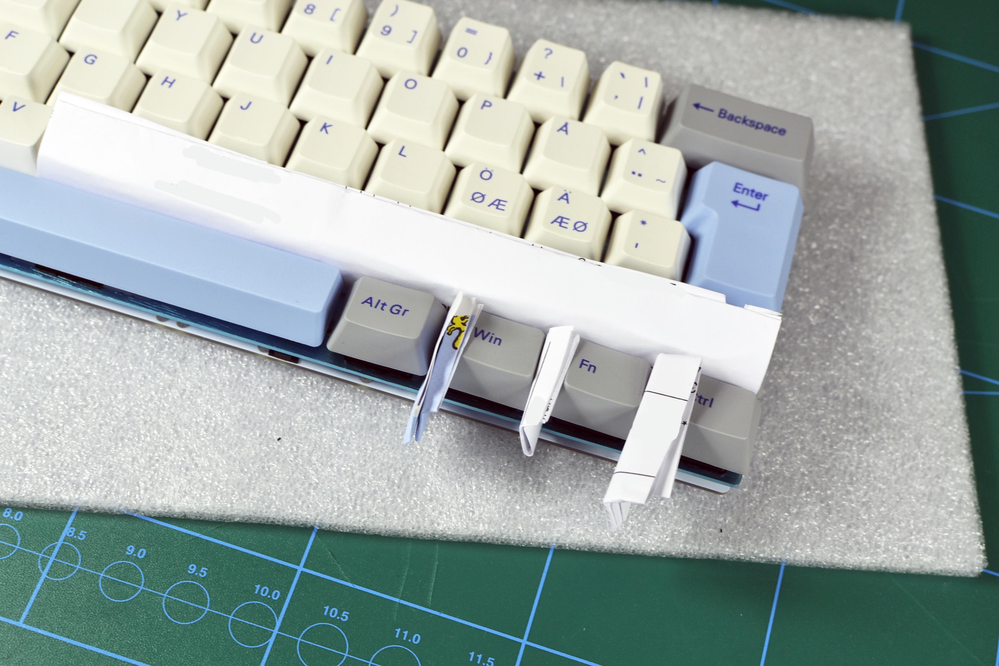 Innan vi sätter igång med att löda fast våra brytare så använder vi papper för att se till att de sitter rakt. Det är nu som våra monterade brytarlock blir till hjälp, eftersom att det dels blir enklare att se ojämnheter, men de håller även brytarna raka när vi pressar med papper. Många skippar just detta steg om de inte stör sig på att någon enstaka brytare sitter lite snett, men vi passar på.