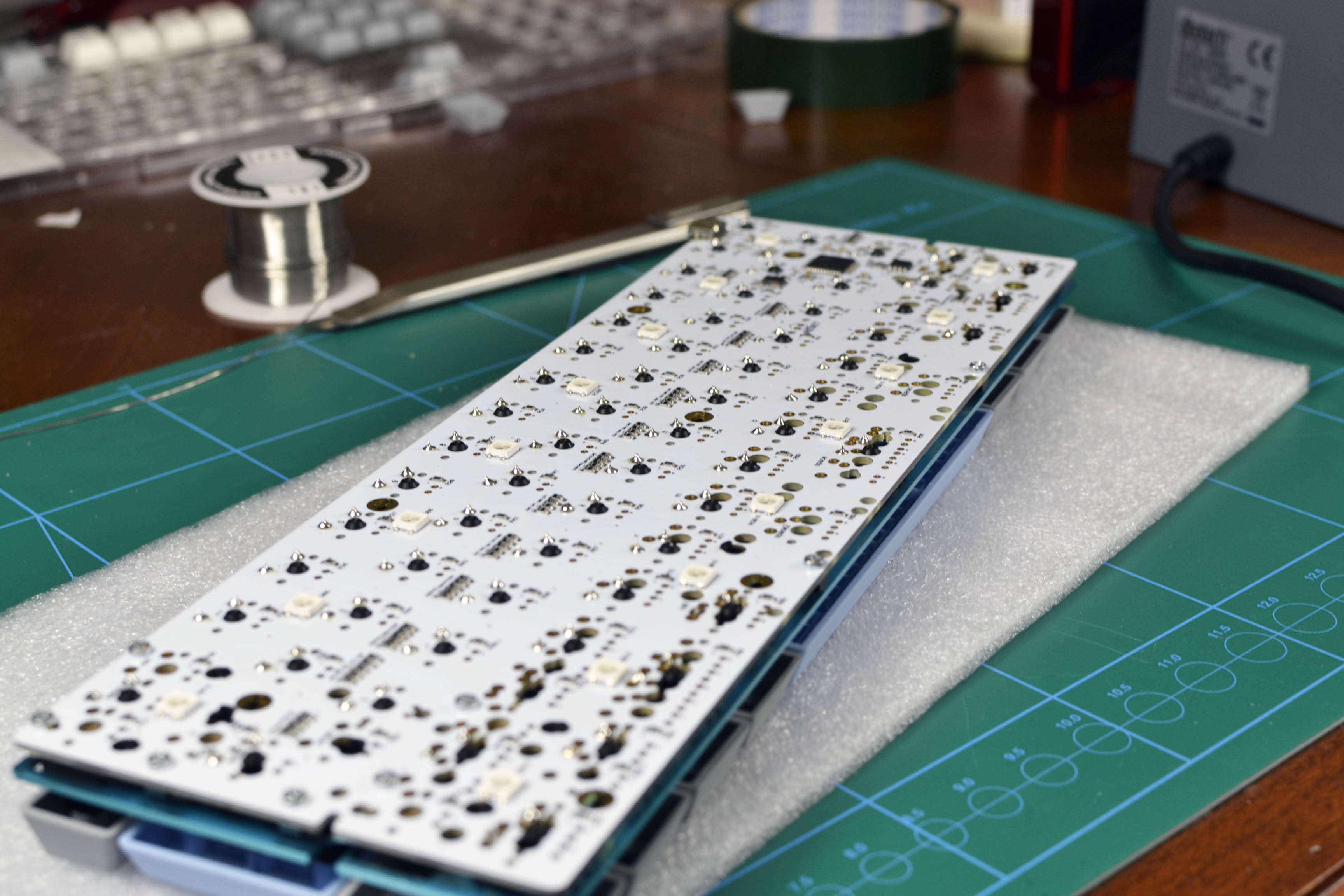 Innan vi sätter igång och löder så värmer vi upp vårt lödjärn och för över vårt tenn för att bilda ett tunt lager på lödspetsen – det ser till att vårt lödjärn inte rostar. Vi börjar med att löda ett par brytare i varje hörn för att hålla fast konstruktionen, därefter jobbar vi rad för rad. Se till att göra rent lödspetsen ofta under bygget, efter ett par brytare kan det vara läge att dra fuktad svamp för att rengöra spetsen, och därefter lägger vi på ett nytt, tunnt lager tenn.