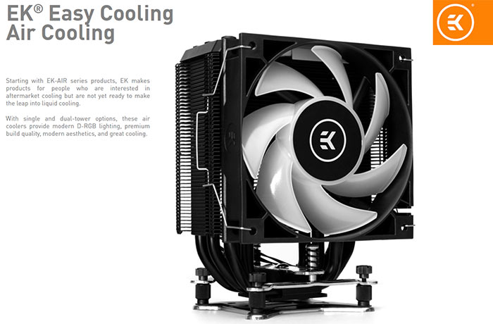 Under sitt onlinebaserade evenemang “EK Cooling Expo” har företaget bekräftat att det i dagsläget har en serie mer traditionella processorkylare under utveckling. Serien kommer att gå under namnet EK-AIR och kommer att innehålla luftkylare med både ett och två torn av kylflänsar.