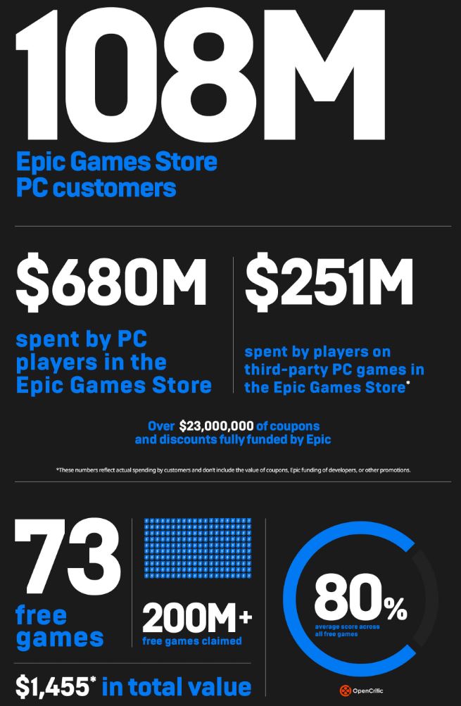 Epic Games har även visat en del statistik för sin onlinebutik. Totalt ska 108 miljoner olika PC-användare ha registrerat sig på plattformen och speltitlar för totalt 680 miljoner dollar ska ha sålts via butiken. 251 miljoner av dessa dollar ska ha lagts på speltitlar från tredjepartsutvecklare.