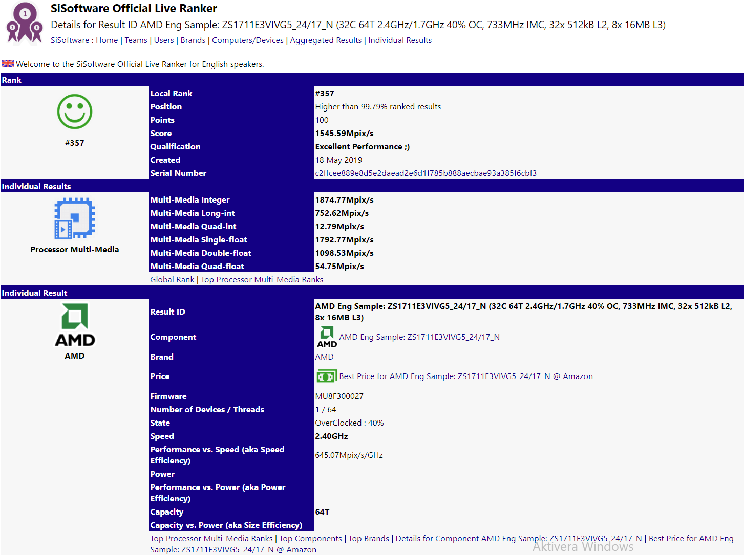 Enligt ovanstående bild går det att se den 64-kärniga Epyc Rome-processorn placera sig på tredje plats i rankningen för testsvitens aritmetiska test. Vilket gör den till den tredje bästa i detta område som någonsin registrerats i databasen.