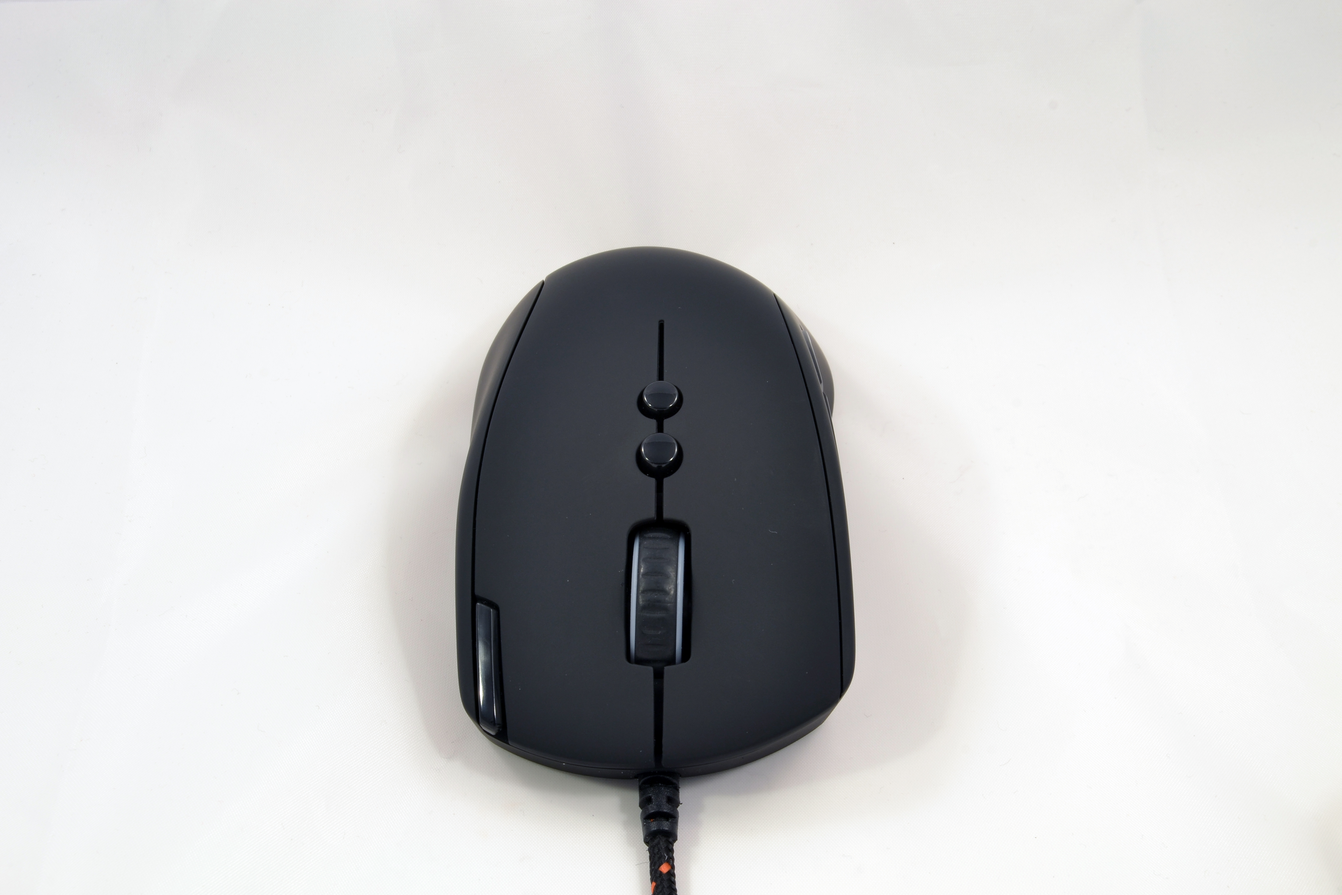 På musen ovansida hittar vi givetvis musknapp 1 och 2 men till höger om musknapp 2 sitter en ganska smart placerad profilknapp som är aningen upphöjd och bakom de två huvudknapparna finns DPI-knappar föratt höja och sänka DPI-nivåerna. Scrollhjulet är gummerat för ökat grepp och har LED-belysning med stöd för 16,8 miljoner olika färger.