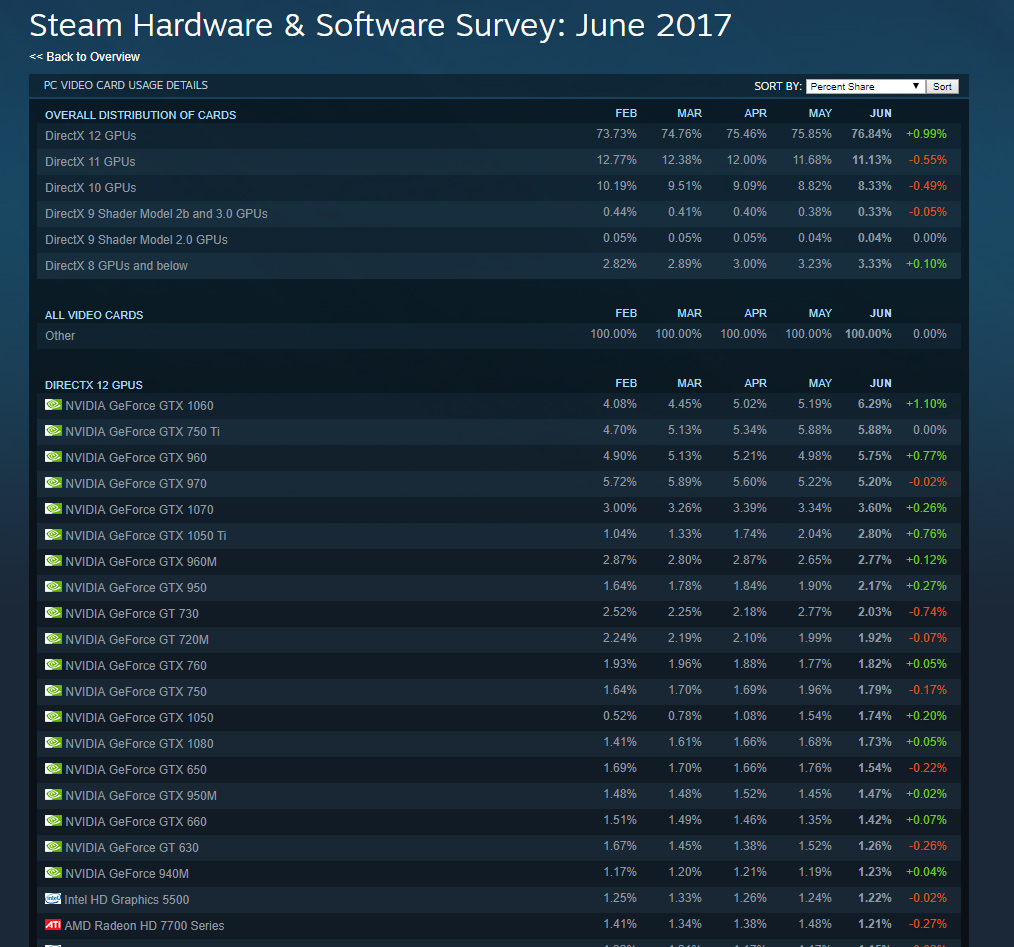Först på 21:e plats hittar vi det första AMD Radeon-baserade grafikkortet i form av Radeon HD 7700-serien. Nya Radeon RX 500-serien hittas över huvud taget inte på Steams topp 50-lista.
