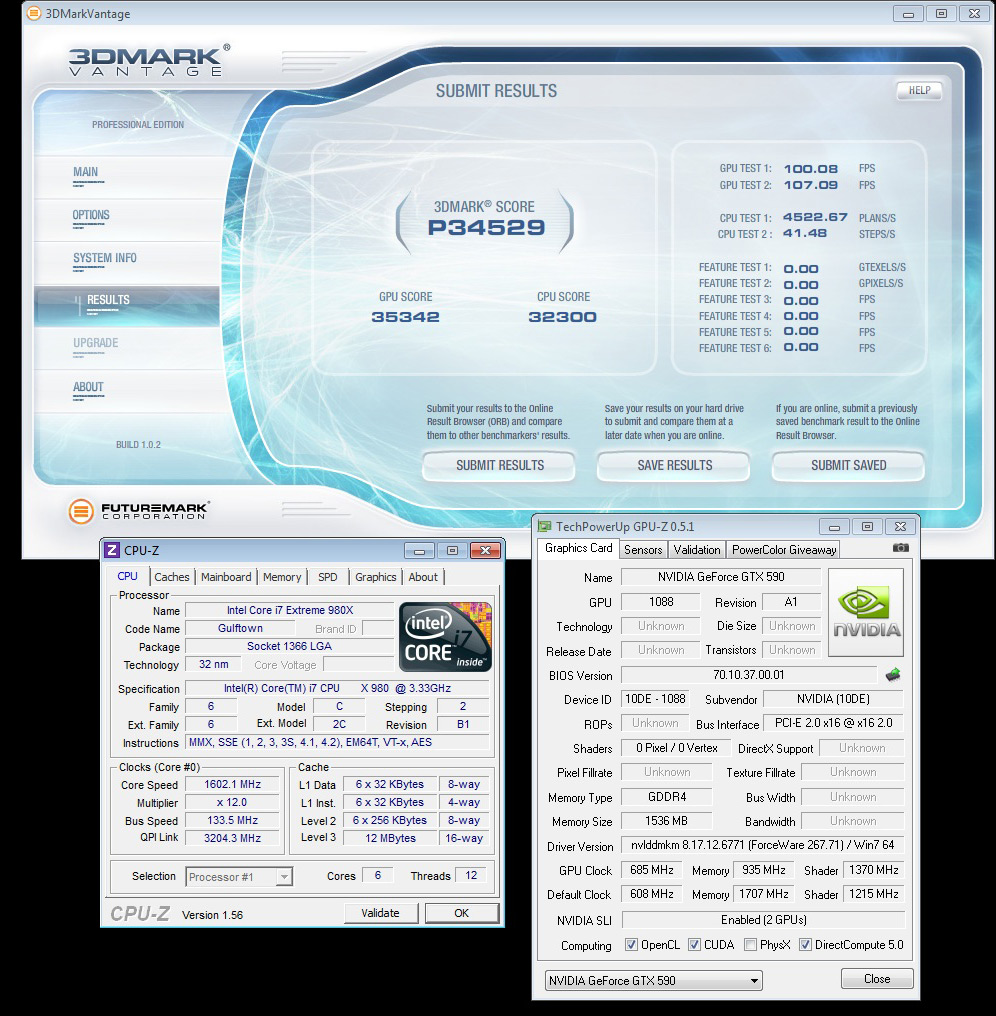 NVIDIA däremot har betydligt effektivare beräkningsenheter och brukar ge konkurrenskraftig prestanda med några hundratal CUDA-kärnor. I GeForce GTX 590 hittar vi totalt 1 024 CUDA-kärnor (2 x 512) vilket alltså borgar för riktigt god prestanda.