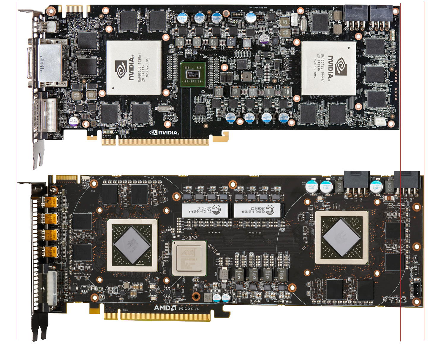 GeForce GTX 590 har egentligen sämre specifikationer än Radeon HD 6990 på de flesta punkter, men med flera ROPs är pixelfillraten något högre på NVIDIA-kortet, samtidigt som den breda minnesbussen bara precis ger lite bättre bandbredd. NVIDIA har strypt klockfrekvenserna på sina GDDR5-minnen rejält, något AMD drar nytta av. Noterbart är också att GeForce GTX 590 “endast” utrustas med 3GB minne, vilket kan ge Radeon HD 6990 fördelar i högre upplösningar där man kan nyttja sina 4GB minne på ett bättre sätt.