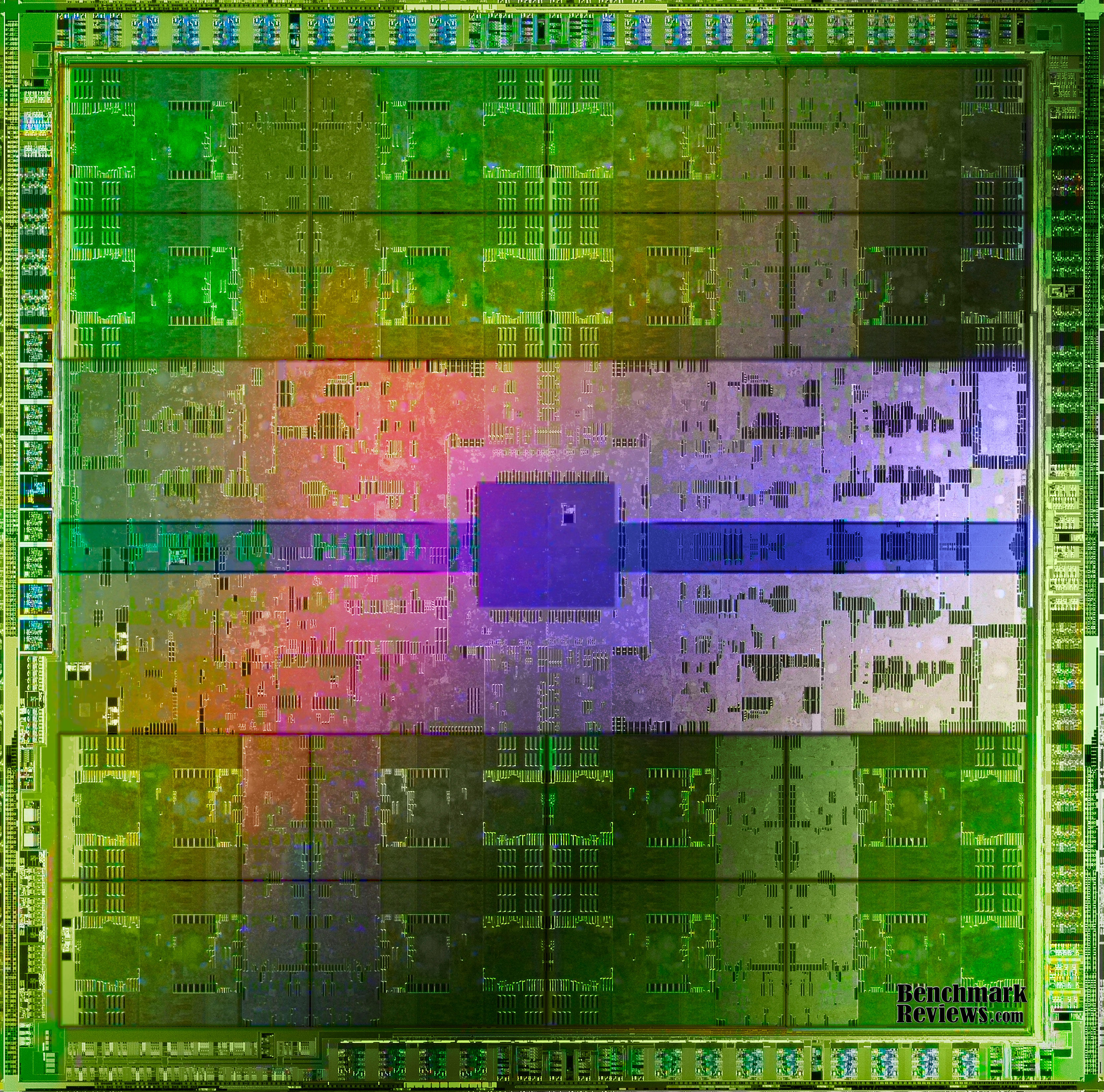GF110-grafikkretsen med sina 512 CUDA-kärnor och sex 64-bit minneskontroller.
