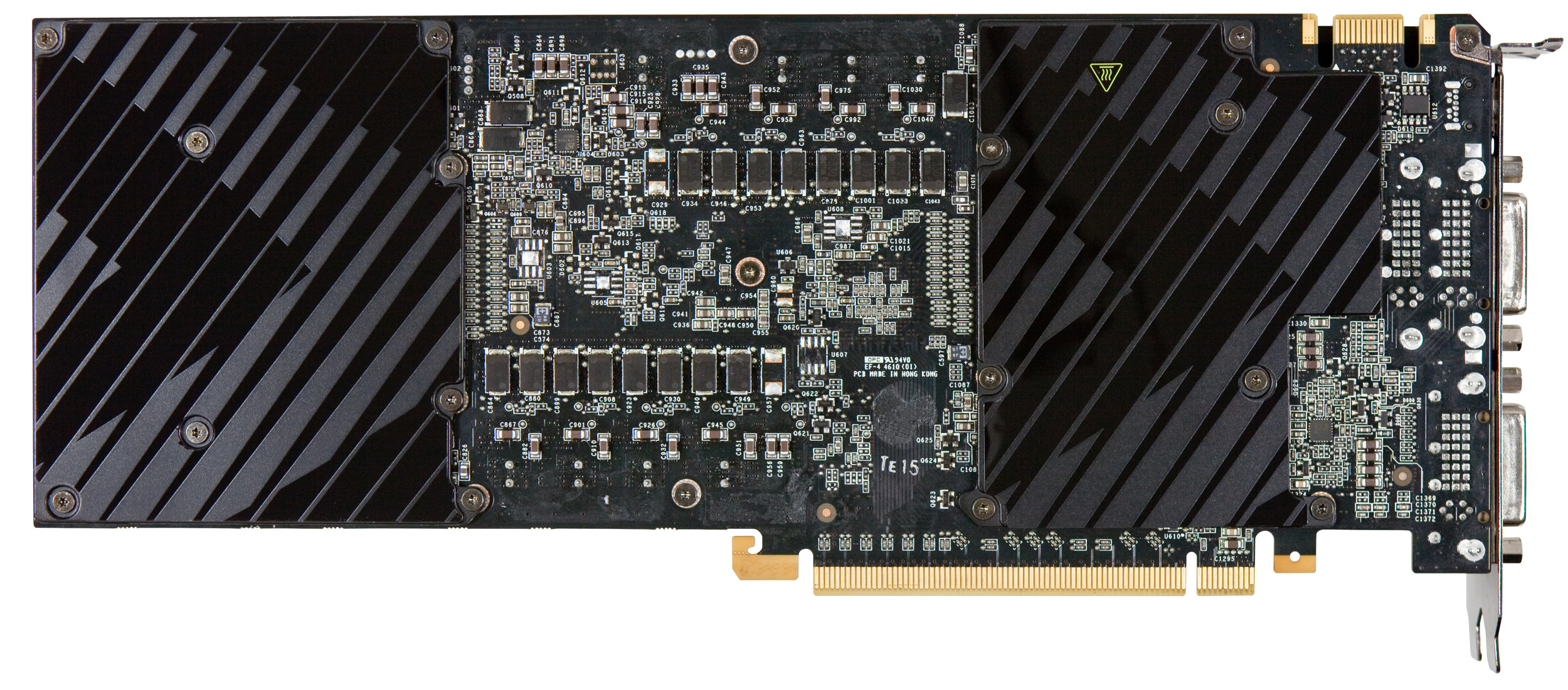 Baksidan av grafikkortet avslöjar de två aluminumplåtar som skyddar grafikkortets minnesmoduler från överhettning. Den rejäla strömdelen skådas också på baksidan av kortet.