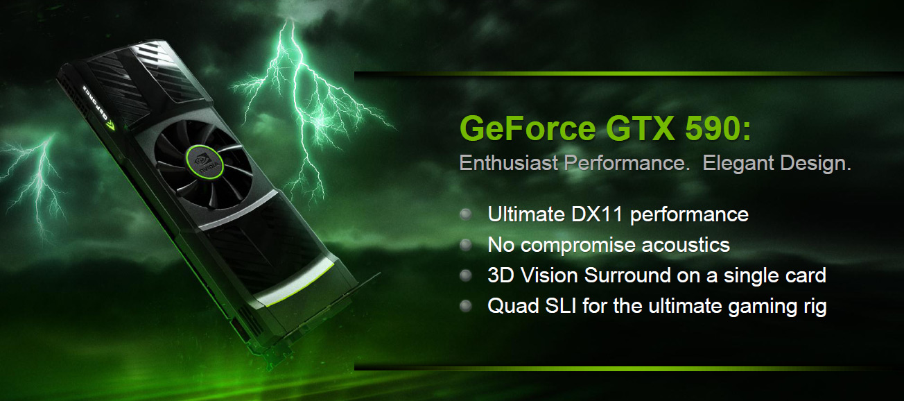 GeForce GTX 590 är NVIDIA:s första grafikkort med dubbla grafikkretsar sedan januari 2009. Då lanserade man sitt GeForce GTX 295, som med två monstruösa GT200b grafikkretsar använde sig av en än idag udda sandwich-design.