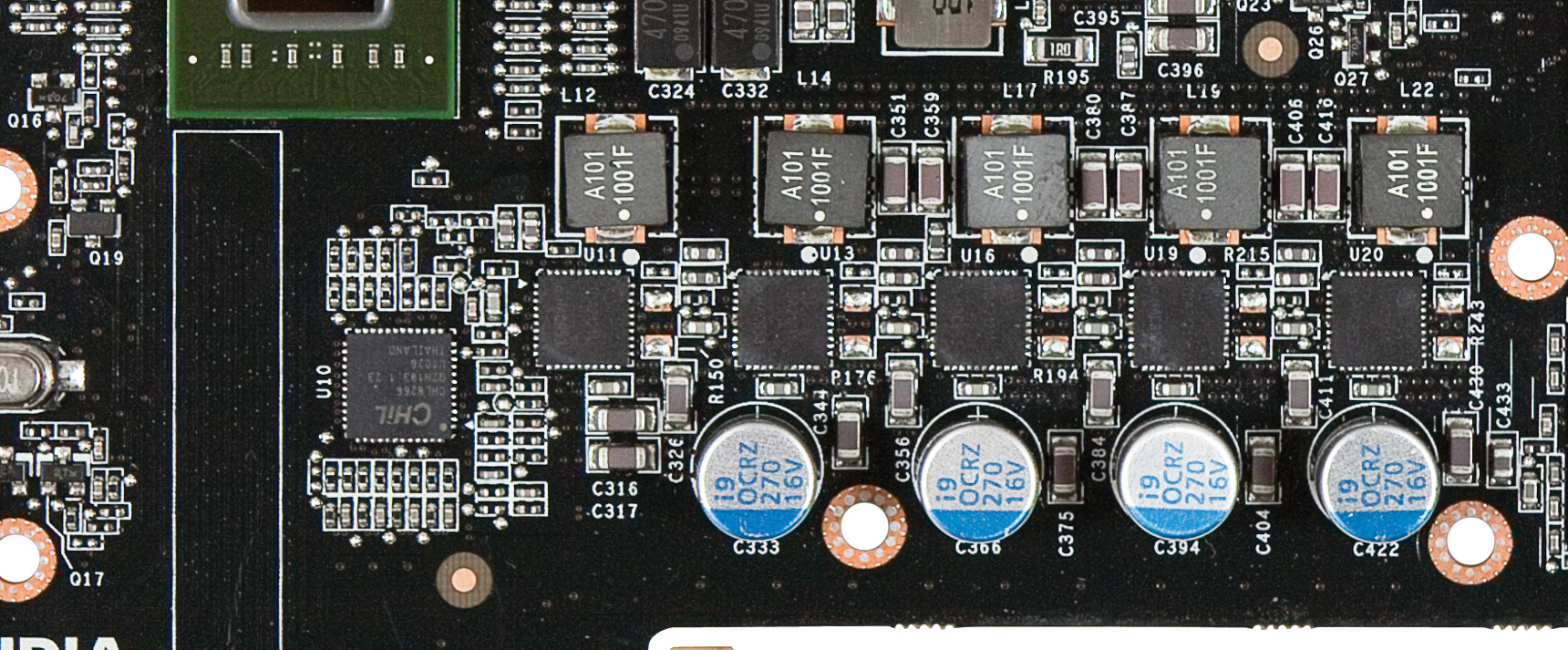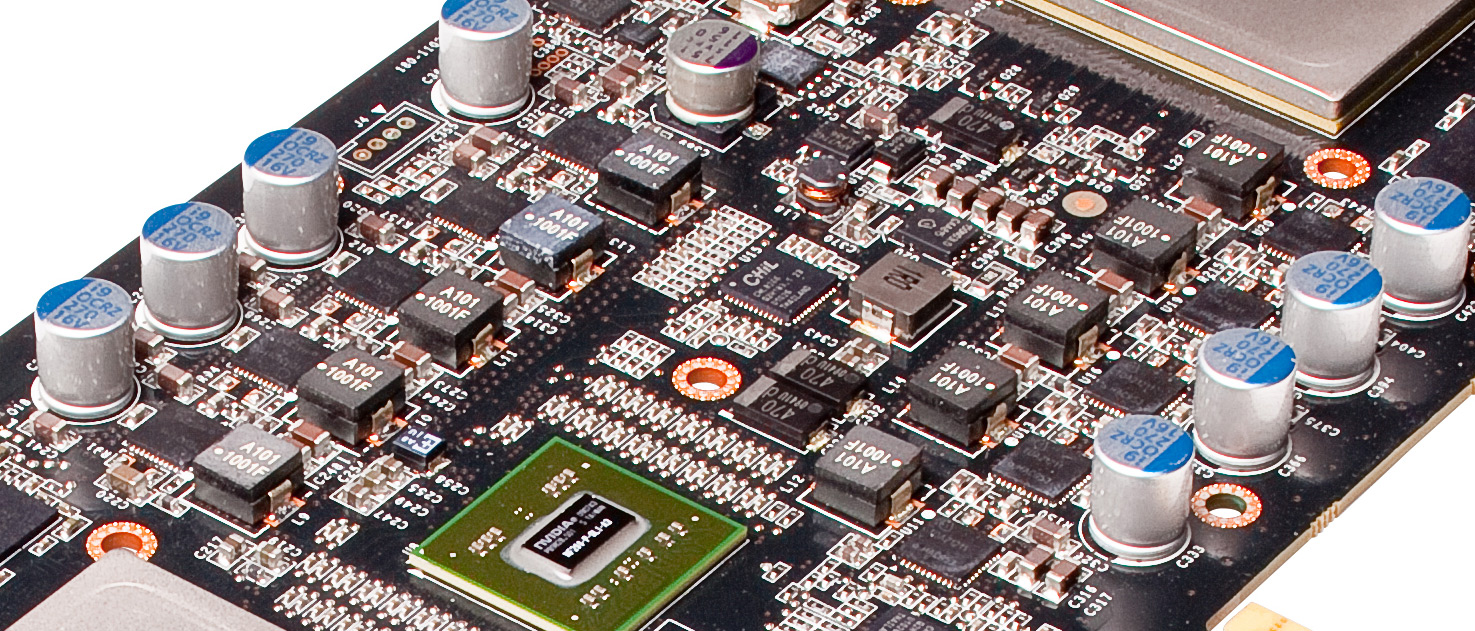 För att nå sitt mål om ett kraftfullt men relativt tystlåtet grafikkort har NVIDIA börjat med kretskortet. För maximal signalkvalité är grafikkortets PCB uppbyggt i 12 lager och genom att använda sig av extra koppar i kortets ström och jordlager (2 ounces, 70µm där standardtjockleken är 35µm) ska man förbättrat ledningen av värme från kortets känsliga komponenter. Med en digital strömdel på totalt 10 faser för GPU samt 4 separata faser för GDDR5-minneskretsarna ska spänningarna hållas stabila och minska energiförluster.