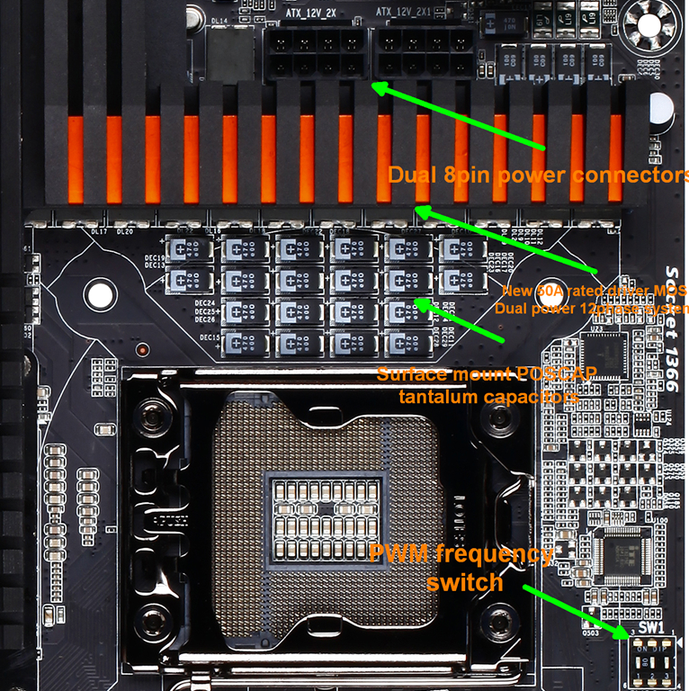 Gigabyte hasn’t held back when developing the X58-OC motherboard and beside an oversized power supply with 50A MOS circuits in a 12-phase configuration you can change the PWM frequency to get the very last drops from the processor during extreme overclocking. A solution Gigabyte calls OC-VRM.