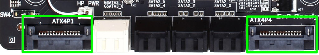 OC-PEG is another piece of the power supply puzzle where it uses two SATA power connectors, placed around the SATA ports, for giving the PCI Express slots extra juice during overclocking with 3 and 4 graphics cards. These connectors can be used to connect a second and third power supply if you want.