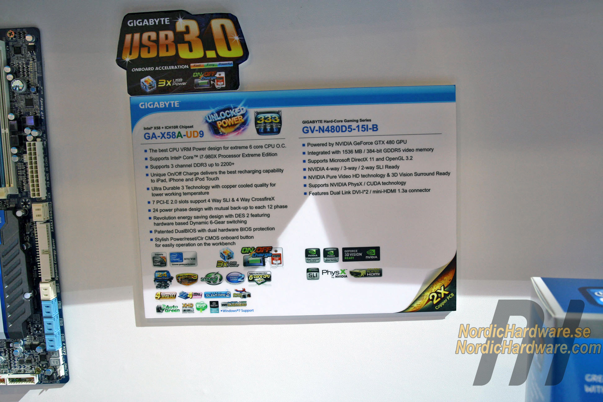 Gigabyte has used two Nvidia NF200 bridge chips together with seven PCIe x16 slots for some truly immense graphics card setups. During Computex the company demonstrated the motherboard handling four GeForce GTX 480 graphics cards in 4-way SLI. Enough to raise the pulse of most enthusiasts.