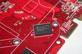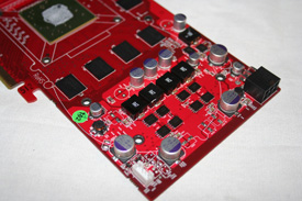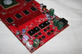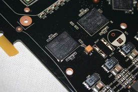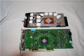 Vi är dock inte här för att sitta och diskutera estetik, utan vi har ett par grafikkort att kika närmare på. Vänder man på kortet uppenbaras en stor svart plåt som täcker mestadelen av baksidan, tillsammans med ett par hål under kärnorna och här ser vi att hålen runt kärnan är desamma som för “vanliga” Radeon HD 3870, vilket gör att man kan montera på vilken kylare man vill. Även avståndet mellan kärnorna känns ganska tacksamt om man ska göra just detta. Den svarta plåten sitter inte här enbart för skojs skull, avlägsnar man den dyker helt plötsligt åtta minneskretsar á 1Gbit stycket upp, tillverkade av Samsung. Asus-kortet å sin sida använder Hynix-minnen specifierade till 0.8ns.