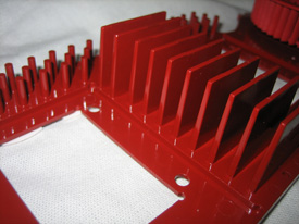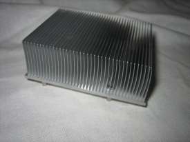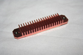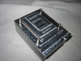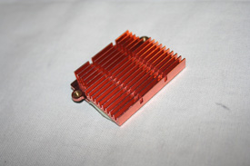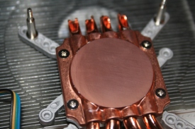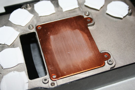 De nästkommande två delarna är de som placeras rakt ovanför kärnorna, ett par små, löstagbara flänsar. Intressant nog har AMD valt att spara lite pengar (och vikt) på att skeppa samtliga Radeon HD 3870X2 med två flänsar i olika material; kylaren närmast fläkten i tunneln under plastkåpan får nöja sig med aluminium samtidigt som kärnan närmast utblåset får en lika stor, men tyngre, kopparklump att leda värme till. Förklaringen är simpel, det blir helt enkelt varmare ju längre in i “tunneln” man kommer, därför har man valt att sätta koppar på den ena kärnan, men inte på den andra. Billigare och viktbesparande att göra den ena i aluminium.