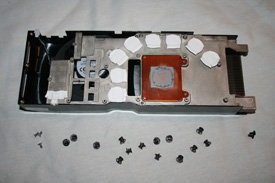 Självfallet gillar vi att dissekera hårdvara, så vi greppade tag i första bästa skruvmejsel och vände på kortet, och nedan har vi resultatet; en hemsk massa skruvar behövs för att lossa kylaren från kortet, närmare bestämt 19 stycken. Det viktigaste är dock att kylaren kyler allt den är tänkt att kyla med ordentlig kontakt. För ordentlig kontakt hade man kunnat dra ner mängden kylpasta till ungefär en tiondel och låtit bli att sandpappra kopparbasen, om vi ska vara riktigt ärliga.