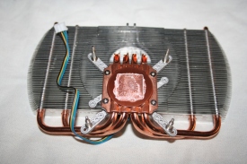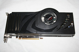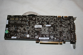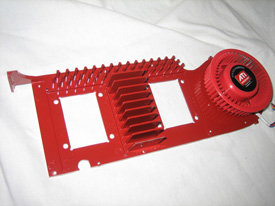 Kylaren som skeppas med samtliga kort av referensdesign är en, av förståeliga skäl, väldigt lång sådan som tar upp två kortplatser vare sig man vill inte. Av allt att döma bör ett kort av den här storleken vara en riktig tungviktare, men riktigt så är inte fallet; kortet väger ungefär som ett gammalt hederligt Radeon HD 2900XT. Kylaren som kyler framsidan av kortet är i princip en konstruktion som består av fem delar, först en aluminiumplåt med relativt grova flänsar gjutna ur ett stycke rakt ovanför PCI-E-bryggkretsen, som synes nedan. Fläkten, del nummer två, är fastsatt i denna plåt. Plåten kyler som sagt PCI-E-bryggkretsen, men även minnena på ovansidan samt diverse strömförsörjningskomponenter.