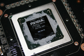 Då GeForce 9800GTX egentligen inte bjuder på något nytt (det här nVidia-kortet heller), har vi egentligen inget direkt intressant att ta upp, mer än att visa en närbild på G92-420-kärnan och en minneskrets som gjorts oläslig med hjälp av tygpadsen som agerar “kylpasta” mellan kretsarna och kylaren. Kortet kommer att landa på $349 till att börja med, vilket bör betyda runt 3000:- i butik i Sverige. Vi hoppas att det inte blir ett dyrt aprilskämt, men prissättningen känns i all ärlighet inte helt galen då 8800GTS 512MB inte är fruktansvärt mycket billigare och detta i princip är samma kort fast överklockat och med tri-SLI-stöd.