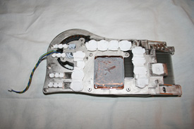 Men vi sa fem delar, eller hur? Den femte delen är helt enkelt plastkåpan som sitter ovanför allting. En plastkåpa som har klätts med ett blåa ögon signerade Ruby, ATI/AMD:s fiktiva karaktär som till 3870X2-lanseringen verkar vara på semester, eller planerar sin comeback för R700 i vår. Eftersom ni på förra sidan har fått skåda plastkåpan tillräckligt många gånger får ni här nedan en bild på vad som istället sitter under kåpan.