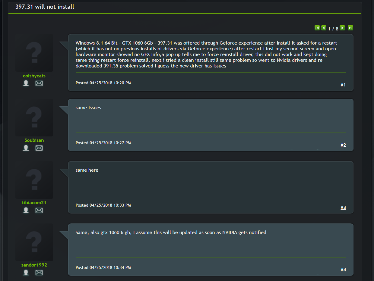 Det verkar dock som att ägare av grafikkort i form av Geforce GTX 1060 har fått något extra i sin drivrutin. Enligt flera användare på Nvidias forum sägs drivrutinen 397.31 WHQL orsaka oändliga omstarter för system utrustade med ovannämnda grafikkortsmodell.