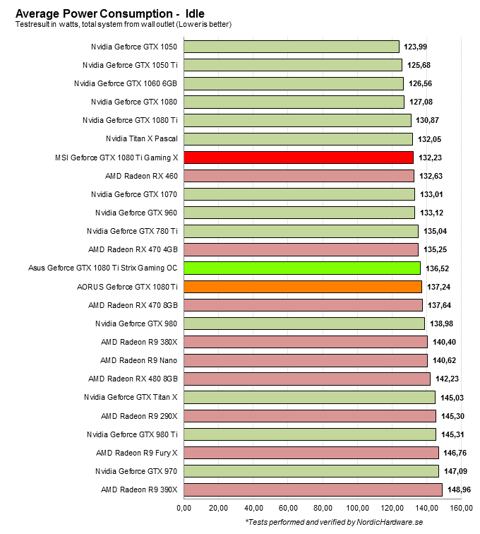 Den genomsnittliga effektförbrukningen för partnertillverkade Geforce GTX 1080 Ti i vila är något högre jämfört med referenskortet, vilket är förväntat med tanke på den uppgraderade strömförsörjningen och högre basfrekvensen.