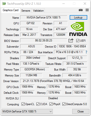 | Nvidia Geforce GTX 1080 Ti | MSI Geforce GTX 1080 Ti Lightning Z | Aorus Geforce GTX 1080 Ti | Asus Geforce GTX 1080 Ti Strix Gaming OC | MSI Geforce GTX 1080 Ti Gaming X | |