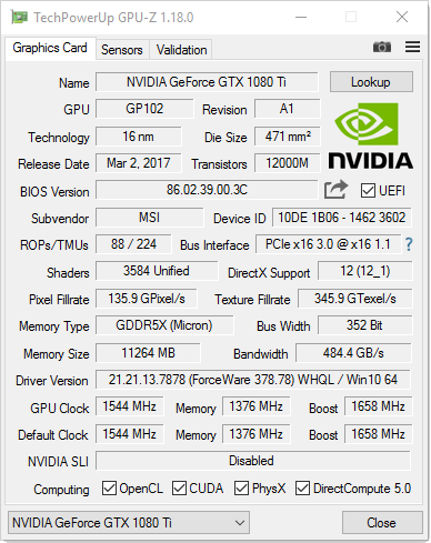 | Nvidia Geforce GTX 1080 Ti | MSI Geforce GTX 1080 Ti Lightning Z | Aorus Geforce GTX 1080 Ti | Asus Geforce GTX 1080 Ti Strix Gaming OC | MSI Geforce GTX 1080 Ti Gaming X | |