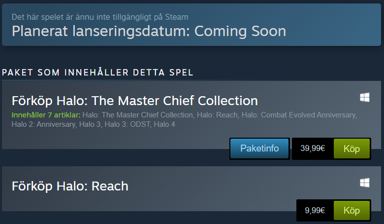 Valves speltjänst Steam har nu öppnat upp förbokningarna för PC-versionen av The Master Chief Collection. Med detta kommer även den officiella prislappen för spelsamlingen och i samma veva bekräftas även priset för Halo Reach om man önskar införskaffa speltiteln separat utanför spelsamlingen.
