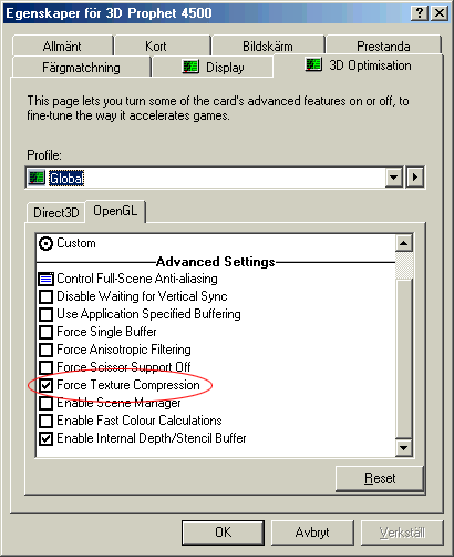 Men det finns en annan sak man kan göra med sitt Kyro II kort och enligt mig är det en självklarhet att slå på denna funktion. Den heter som sagt var Force Texture compression och denna inställning finns i både Direct3D och OpenGL menyn under 3D Optimatsation tabben i avancerade egenskaper för bildskärm.