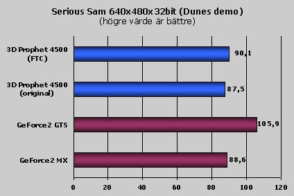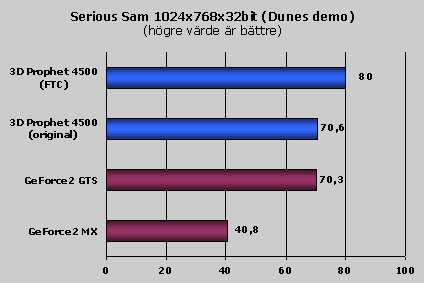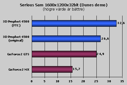 Serious Sam är ett nytt test program här i NHs testlabb och det är enligt min mening ett mycket bra sådant. Det baseras inte helt oväntat på spelet Serious Sam. Det finns flera olika demo man kan köra men vi har valt det tredje, Dunes. Detta spel hade inga som helst problem med att köra både med och utan Force Texture compression påslaget. Så nu kan man verkligen se skillnaden i prestanda mellan de olika lägena.