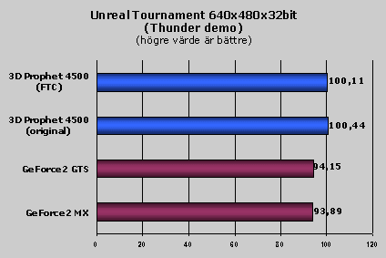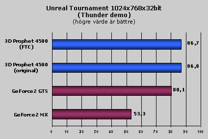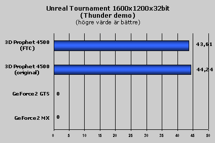 Från två stycken OpenGL baserade spel till ett uppbyggt kring Direct3D. Unreal Tournament är ett hederligtD3D spel som fortfarande hänger med i testlabbet och även om Unreal Tournamnet är ett väldigt processor krävande spel så ska vi nog kunna få ut lite vettiga testvärden. Det var två saker man kunde lägga märke till i Unreal Tournament och det var först och främst att varken GeForce2 MX eller GeForce2 GTS kortet kunde köra spelet i 1600×1200 upplösning. Den högsta upplösning som överhuvudtaget fanns var 1280×960 så det blev inga värden från Nvidia korten i det sista testet. Det andra som man lade märke till var att Force Texture compression inte verkade göra någon nytta överhuvudtaget. Detta var ett faktum som vi skulle få bekräftelse på lite senare.